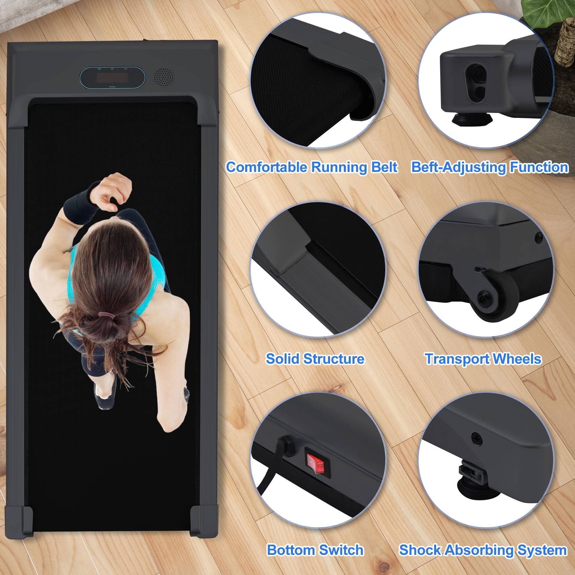 With a 2.5 HP powerful quiet Motor,the electric treadmill is perfect for running, jogging, and walking in the comfort of your home. With a durable steel frame and multi-layer shield design, the under desk treadmill's shock-absorbing and noise-reducing, making your running quieter, safer and more comfortable.
