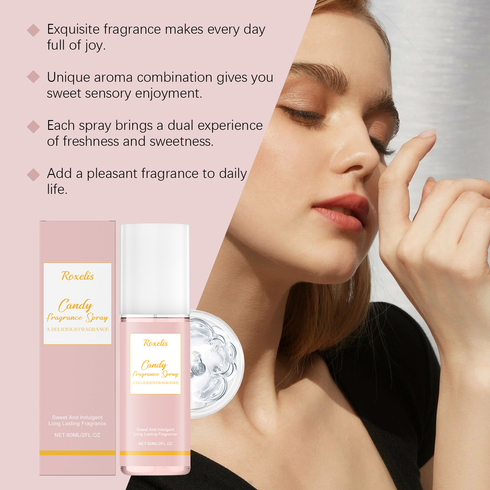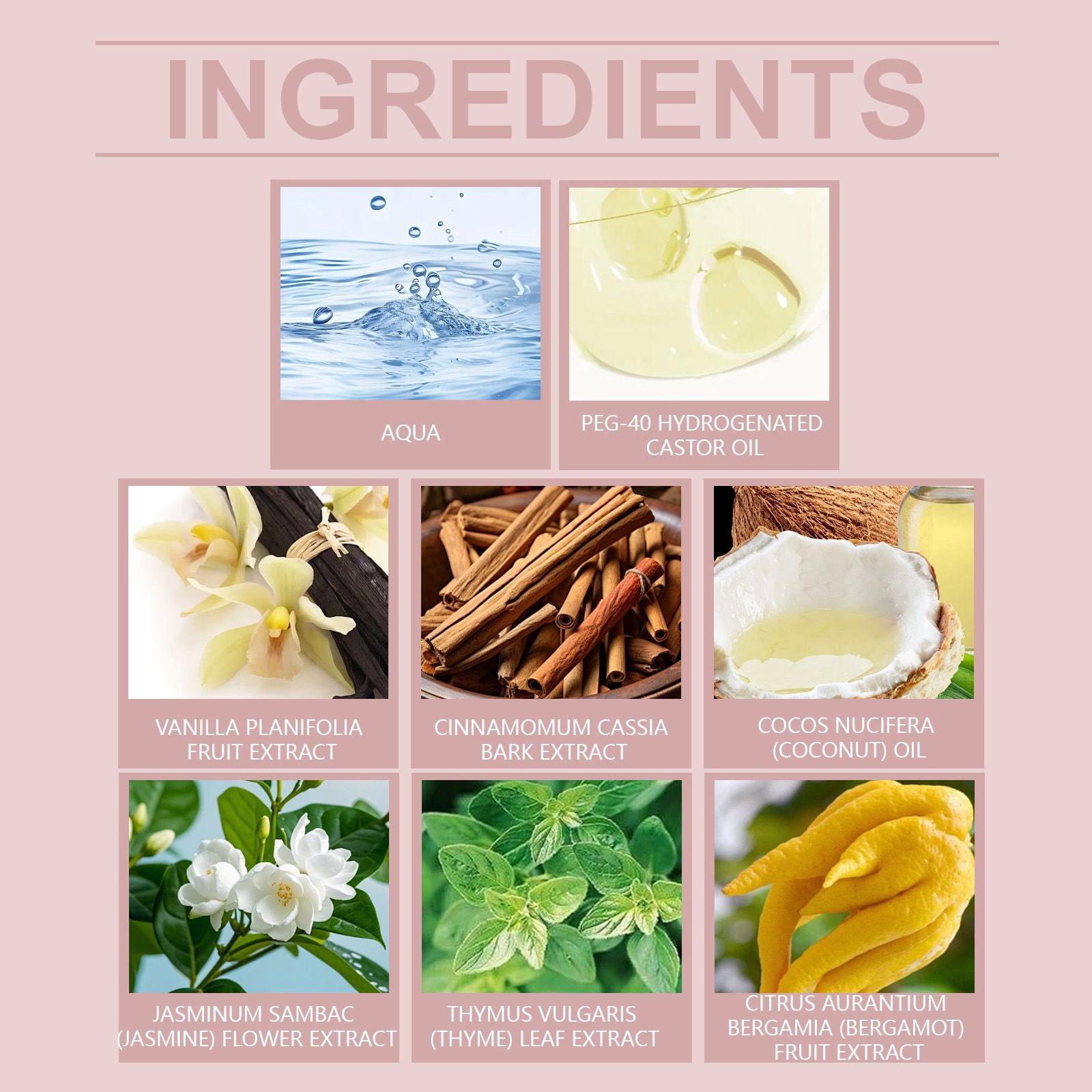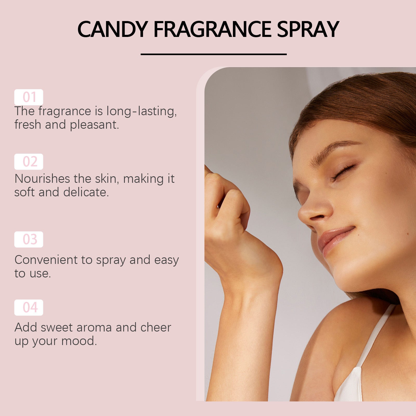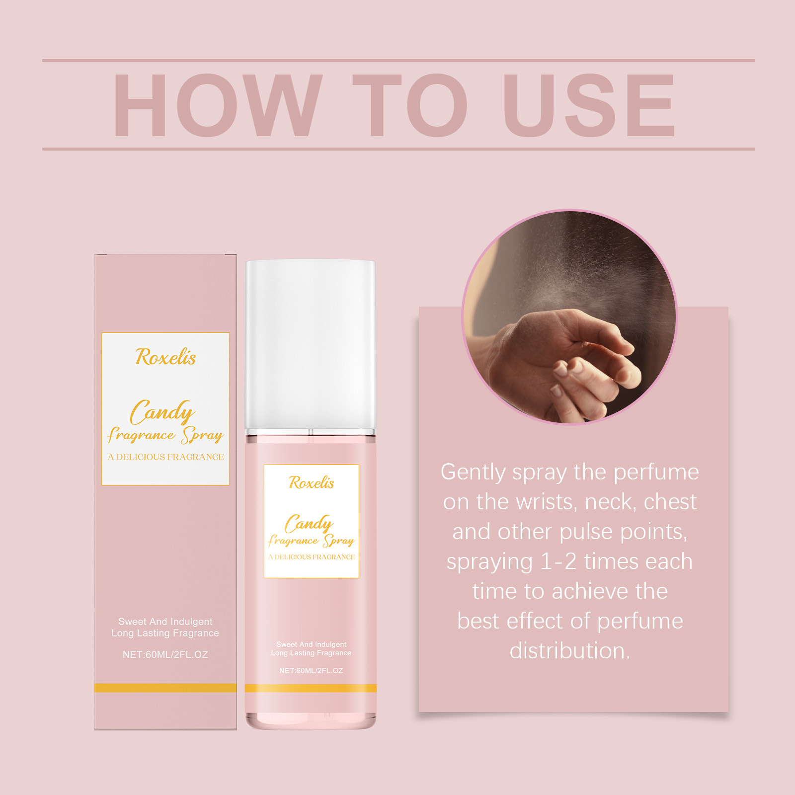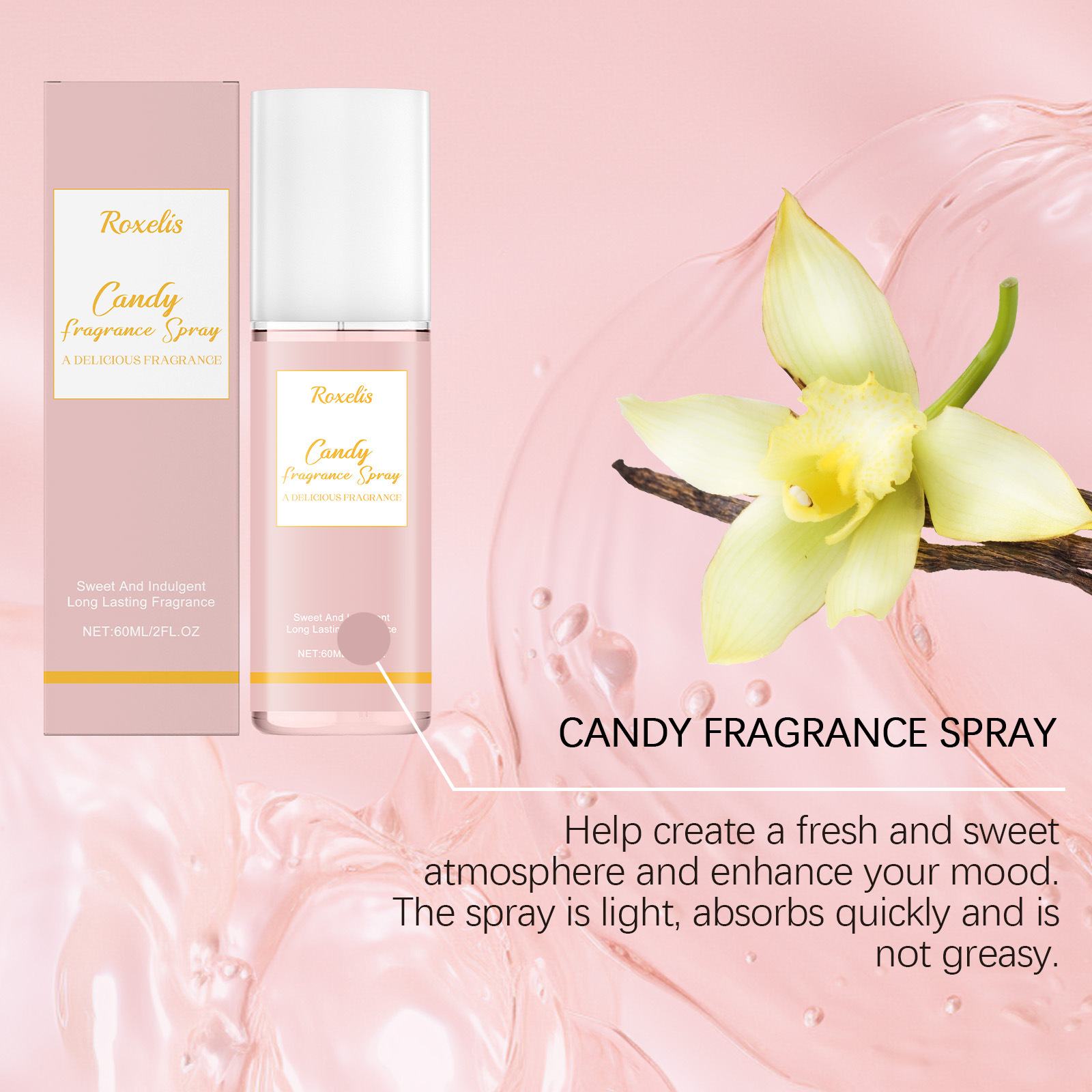 Product information: Product Name: Candy fragrance spray Key words: Perfume Product Capacity: 60ml Ingredients: Water, PEG-40 hydrogenated castor oil, vanilla extract, cinnamon bark extract, coconut oil, Jasmine flower extract, Musk leaf extract, bergamot extract