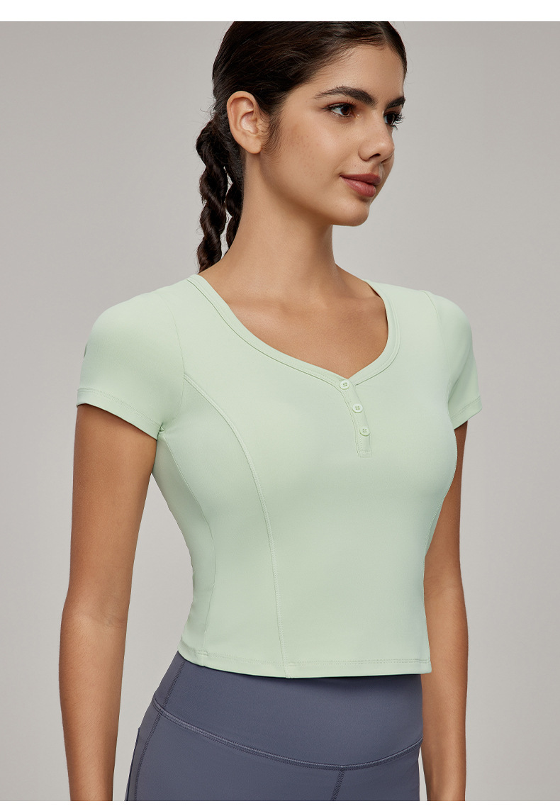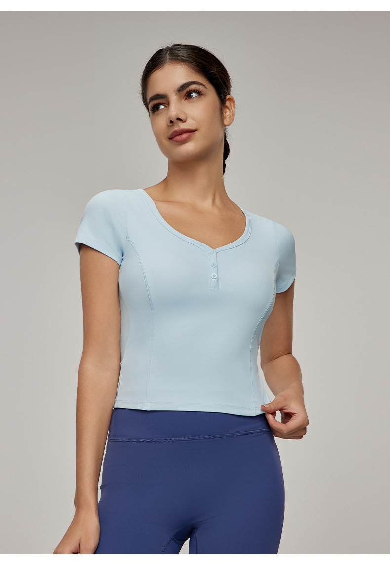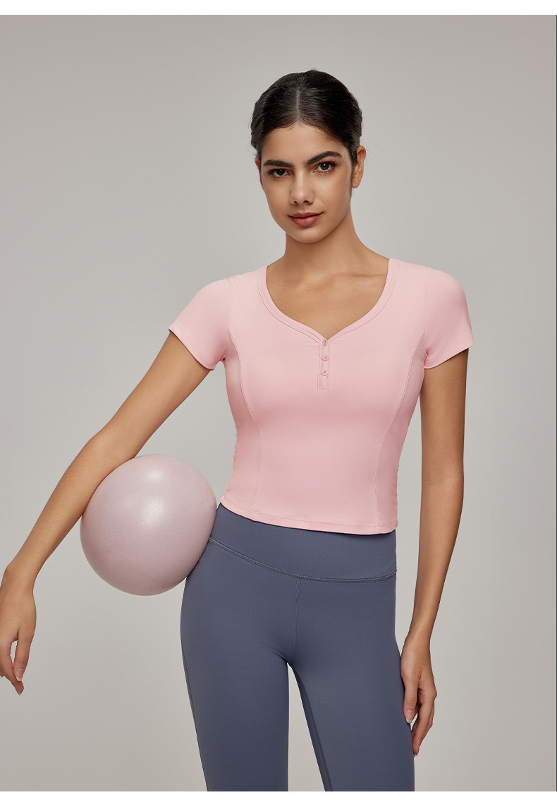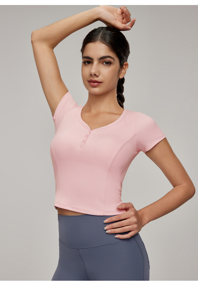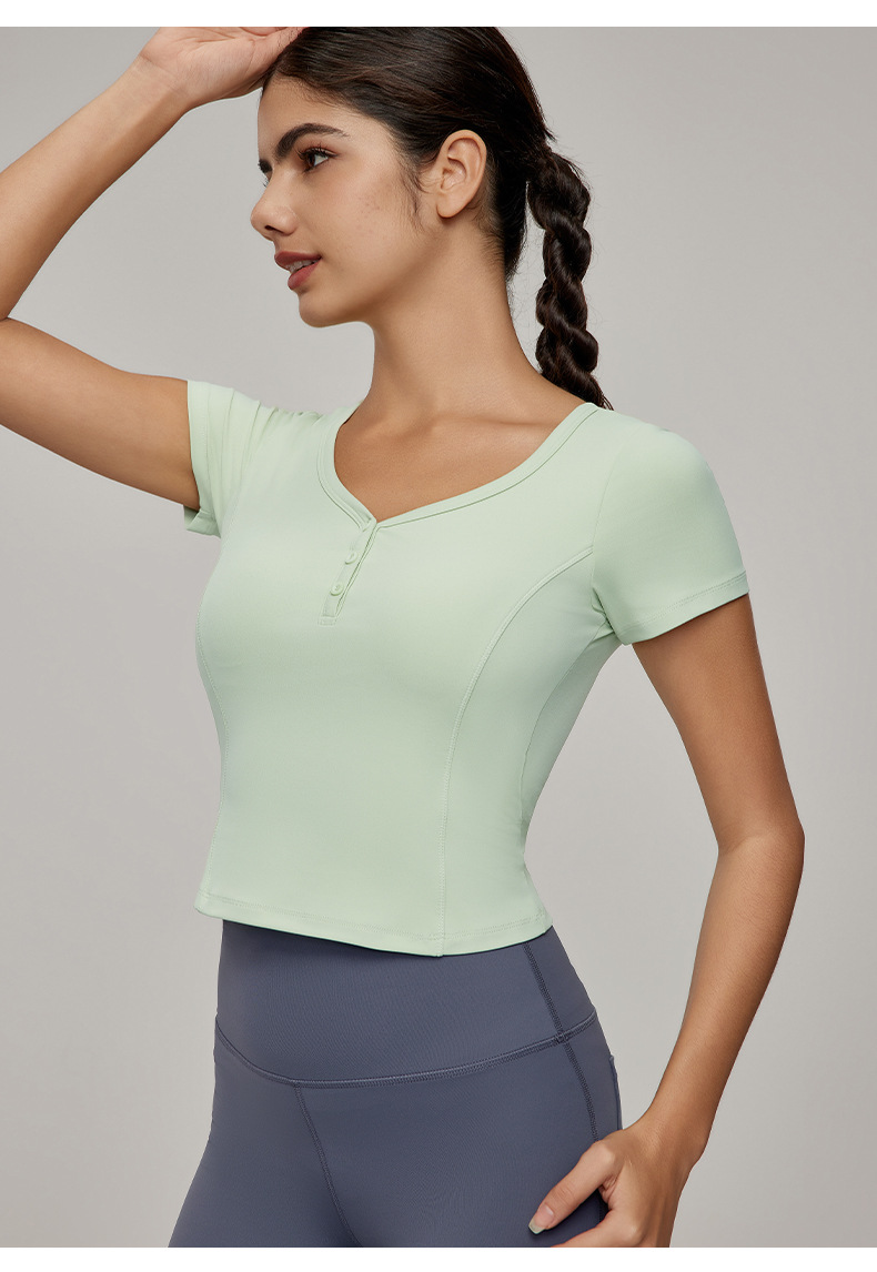 Product information: Color: light creamy green, summer blue, pink beige, black Fabric: polyester spandex plain weave Size: S,M,L,XL Length: waist Function: cool feeling Applicable object: Yoga Fitness Exercise Sleeve length: short sleeve Clothing style: tight