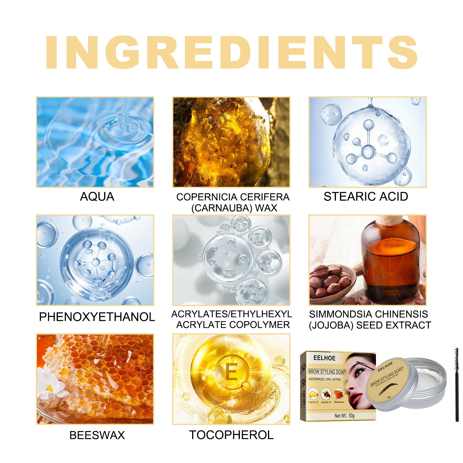 Features: Our eyebrow creams contain vitamin E, Jojoba oil, beeswax.