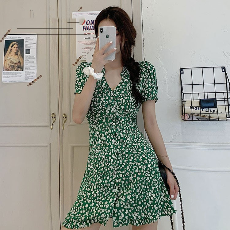 Product information: Fabric: Chiffon Clothing placket: single-breasted Skirt length: short skirt Profile: Type A Skirt type: lotus leaf skirt Sleeve type: puff sleeve Waist type: high waist colour type: Green Size: S M L XL Size Information: Unit; cm Prevention: