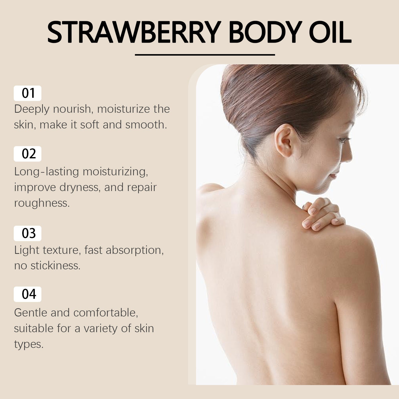 Product information: Net content: 118ml Category: Treatment Oil Ingredients: mineral oil, strawberry extract, olive oil, hyaluronic acid, vitamin E (tocopherol) Size: 12x4.7cm